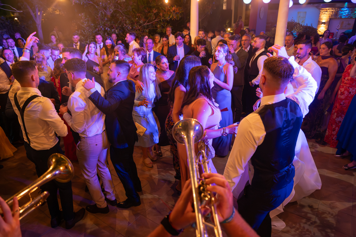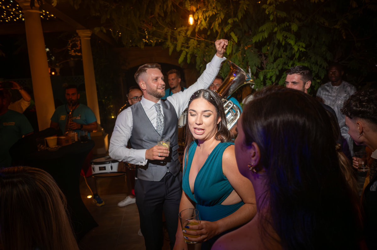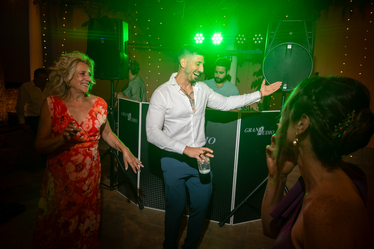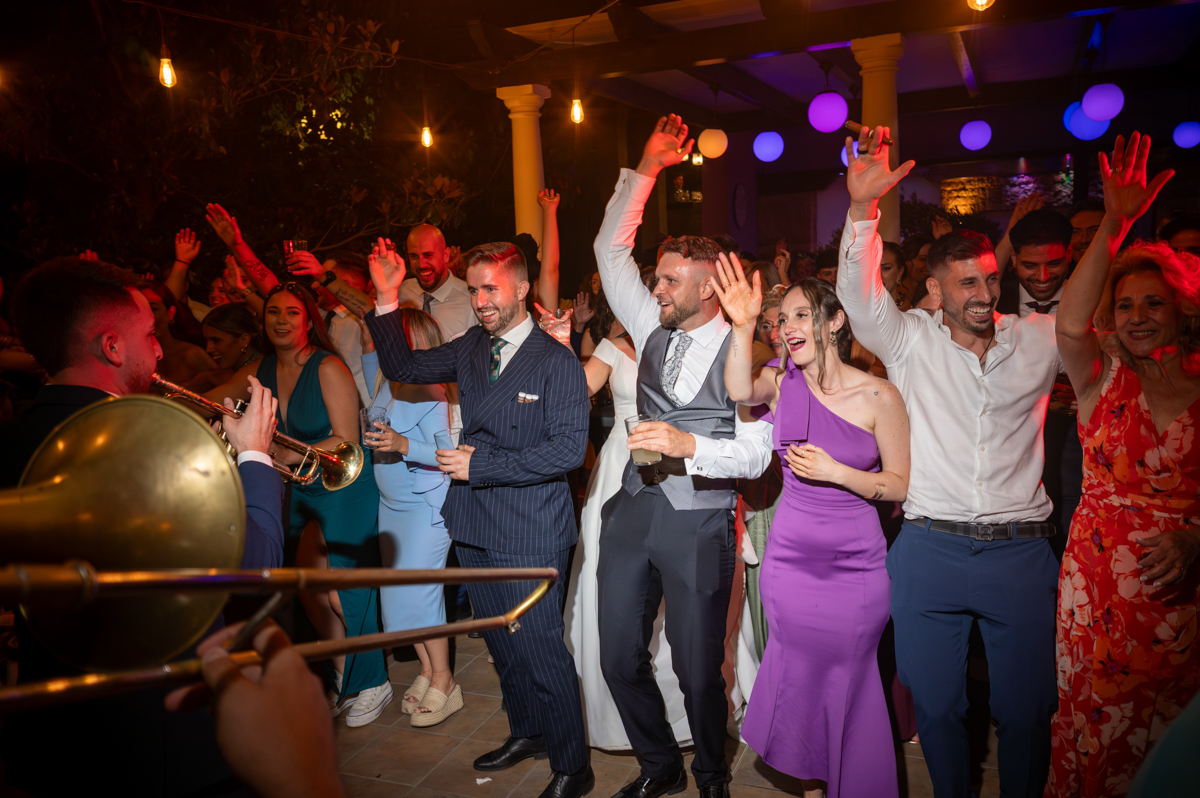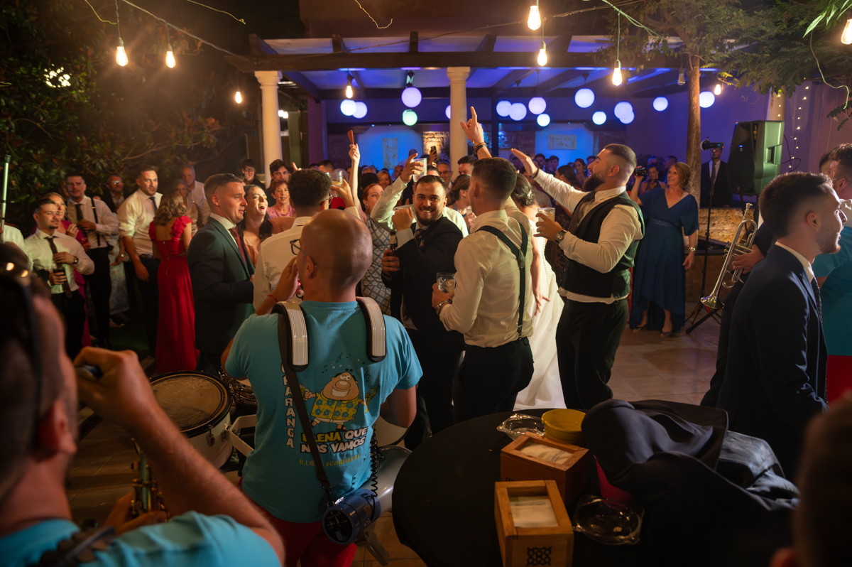 Tras el “sí, quiero”, dio comienzo un gran banquete donde no faltaron brindis, sonrisas y momentos espontáneos. Y cuando parecía que la emoción ya lo había dado todo… arrancó la fiesta. La charanga puso el ritmo y consiguió algo maravilloso: que nadie se quedara sentado. Durante toda la noche, la pista estuvo llena, entre bailes, risas y una energía contagiosa que hizo imposible dejar de disparar fotos.